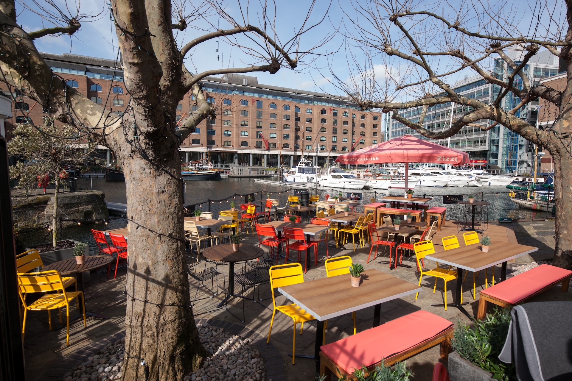 Exterior view of Zizzi St Katharine's Docks showing the vibrant atmospheric outside dining area overlooking St Katharine's Docks.